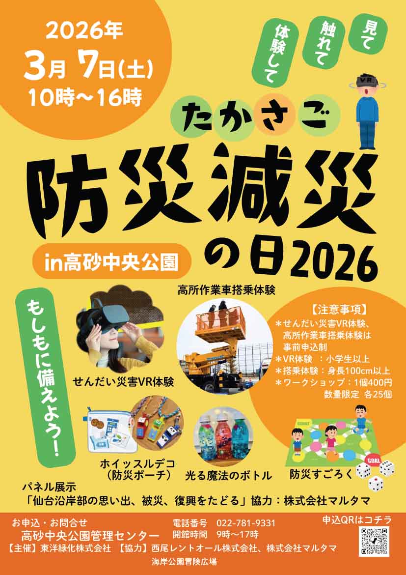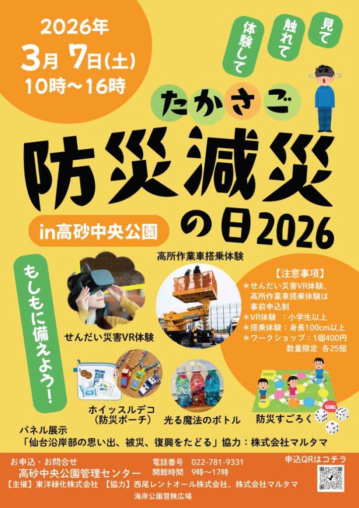 トピックス TOPICS ホーム トピックス イベント情報 2026.02.20 イベント情報 高砂中央公園にて「防災減災の日2026」を開催します! ・2026年3月7日(土曜日) 10:00~16:00 ・VR体験と高所作業車搭乗体験は事前申し込みが必要です 一覧へ戻る